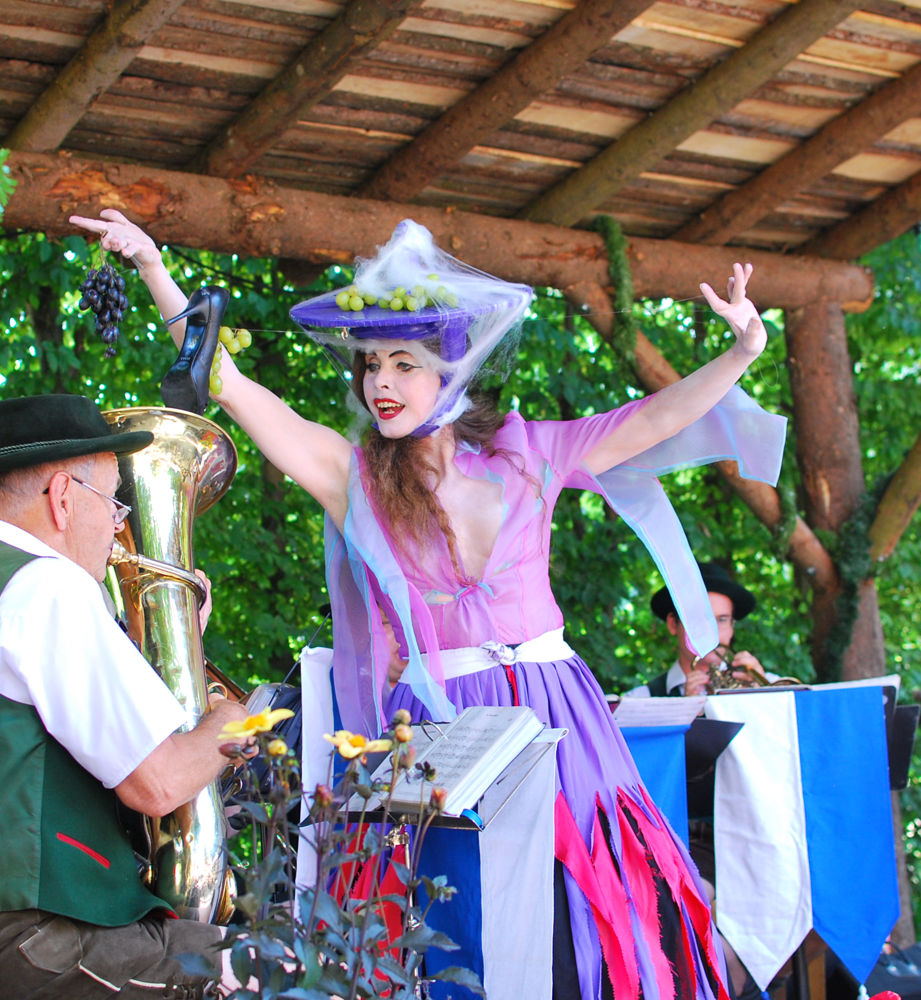 Eine Erscheinung wie aus einer fantasy-Saga, fremdartig, betörend, geheimisvoll…, Lady Uva tanzt leichtfüßig durch die Menschen, zwischen Tubas und Kontrabaß. Sie erstaunt durch Tanz auf den Tischen, sie offeriert köstliche Trauben, die sich scheinbar schwerelos durch die Lüfte bewegen.